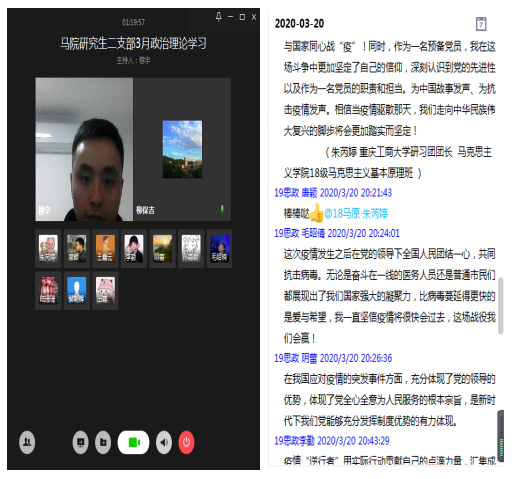 根据学院3月党组织生活学习内容安排和支部主题党日计划,2020年3月20日(周五)19:00,马克主义学院研究生二支部通过企业微信线上平台开展3月政治理论学习暨党员组织生活会,支部12名党员参加了此次学习活动。