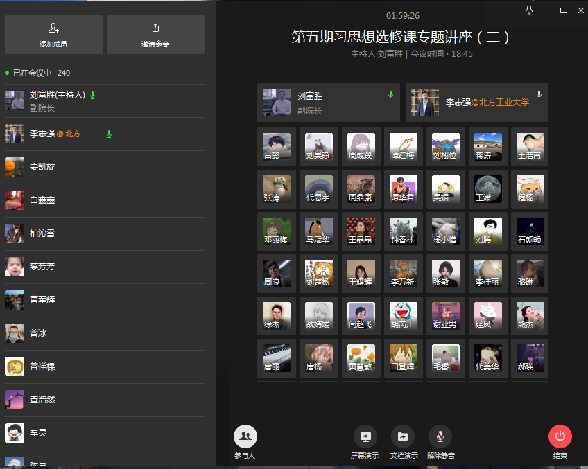 4月22日晚,北方工业大学马克思主义学院李志强教授应邀通过企业微信平台在线为我校“习近平新时代中国特色社会主义思想研究”选修课作了题为“坚持依法治国与以德治国相结合”的专题学术报告。李志强教授是中央马克思主义理论研究与建设工程专家、北京市思想道德修养与法律基础研究会副秘书长,北京市优秀教师,北京市思想政治理论课特级教师。学校党委常委、副校长何勇平,马克思主义学院院长王仕勇、副院长刘富胜,部分思政课专兼职老师、“习近平新时代中国特色社会主义思想研究”选修课第五期232名学员,参加了此次“云”端报告会。本次会议由马克思主义学院副院长刘富胜主持。