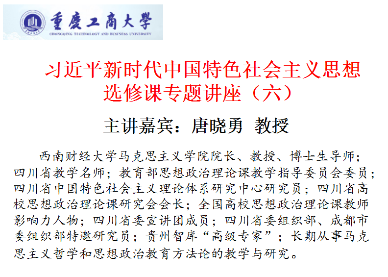 刘院长在讲座总结中谈到,为了高质量的开设、高水平的建设好这门课程,为了拓展重庆工商大研究生们的理论视野,感谢清华大学的刘书林教授、北方工业大学的李志强教授、武汉大学的杨军教授、上海交通大学的李梁教授、吉林大学的白刚教授以及西南财金大学唐晓教授的助力,使师生研究视野不断开拓,理论研究不断深化,学科内涵式发展不断推进。