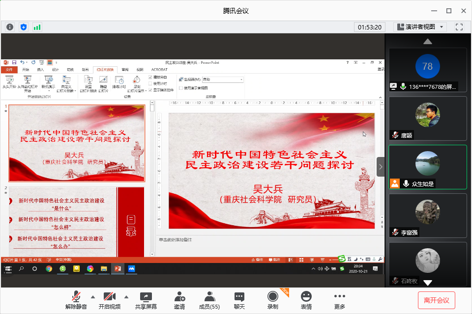 10月21日晚,重庆社会科学院哲学与政治学研究所副所长吴大兵研究员应邀通过腾讯会议平台为我校“习近平新时代中国特色社会主义思想研究”选修课的同学作了题为“新时代中国特色社会主义民主政治建设若干问题探讨”的在线专题学术报告。此次“云”端报告会由马克思主义学院党委副书记、副院长刘富胜教授主持,习近平新时代中国特色社会主义思想研究选修课第六期全体学员和马克思主义学院部分研究生同学参加。