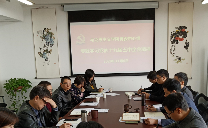 为深入学习贯彻落实党的十九届五中全会精神和习近平新时代中国特色社会主义思想,2020年11月6日上午,马克思主义学院党委理论学习中心组在慧智楼91208会议室专题学习党的十九届五中全会精神。学院党委书记、副院长宋明江同志主持会议,全体党委委员、纪委委员、党支部书记、教研部主任参加学习会。