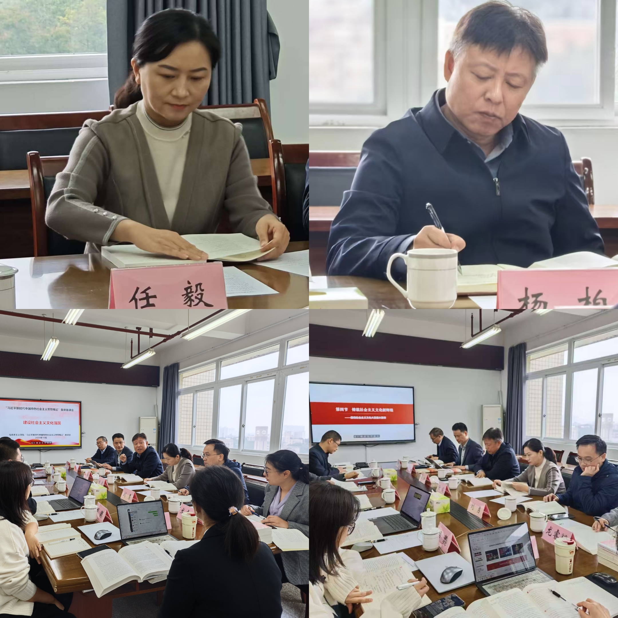 2025年10月30日上午,重庆工商大学马克思主义学院在慧智楼91210会议室召开“习近平新时代中国特色社会主义思想概论”集体备课会。学校党委常委、副校长任毅,党委常委、副校长杨柏,经济学院党委书记唐春秋,马克思主义学院党委书记宋明江,法学与社会学学院院长刘勇,以及习近平新时代中国特色社会主义思想概论教研部全体教师参加本次会议。会议围绕教材第十章“建设社会主义文化强国”展开深入研讨,通过专题说课、交流点评,凝聚教学共识,夯实思政课建设根基。会议由马克思主义学院副院长、“习近平新时代中国特色社会主义思想概论”教研部主任龙睿赟主持。