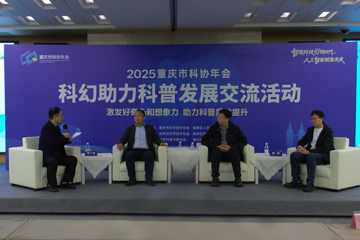 在开幕式上,南岸区领导致辞强调了科幻对激发科学热情与培育创新的作用,现场为大学生科幻科普作品颁奖,并向市民赠送科普读物,市科协领导则指出科幻与科普结合是科学传播的重要创新。在主旨报告环节中,李广益教授探讨了科幻向科普转化的路径,杨国梁副总编阐述了科幻对青少年想象力和科学素养的培养价值。在跨界对话中,谢更新院士、杨国梁和刘洋博士围绕科幻助力科学传播、科技与创意融合等议题展开交流,并与现场观众互动。我院团员积极参与,就 “马克思主义理论学习者如何参与科普传播”“科幻作品中的价值观引导” 等问题与嘉宾交流,深化了大家对科幻科普融合发展的理解。