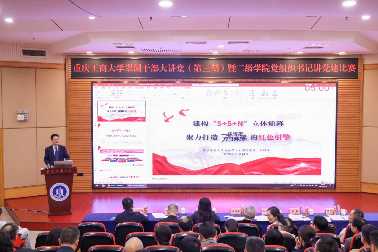 为深入学习贯彻习近平总书记关于党的建设的重要思想,全面提升二级学院党组织书记的政治素质与履职能力,以高质量党建引领学校事业高质量发展,11月14日下午,重庆工商大学翠湖干部大讲堂之二级学院党组织书记讲党建比赛在南岸校区博智楼7200报告厅隆重举行。