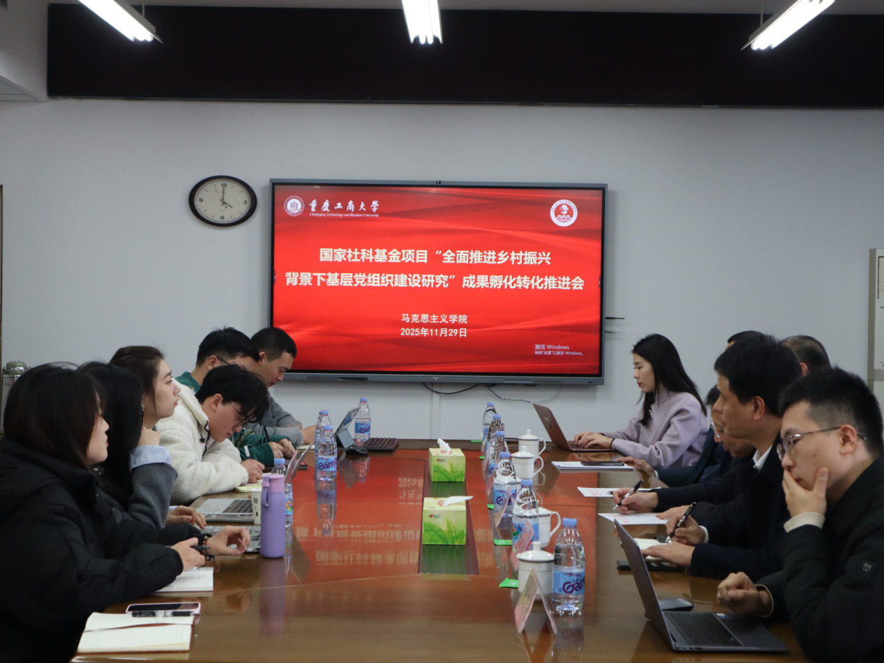 11月29日,为推动国家社科基金项目“全面推进乡村振兴背景下基层党组织建设研究”的成果凝练与深化拓展,马克思主义学院举办该项目成果孵化转化推进会。陕西师范大学教育学部李森教授、重庆市教育委员会张东研究员、重庆市育才中学刘雅林研究员、重庆市教育评估院张晓亮等专家学者出席,学院党委书记、项目负责人宋明江教授主持会议,学院部分师生参加会议。