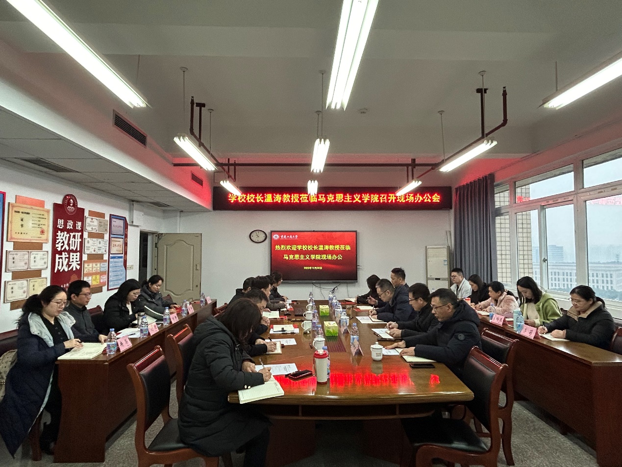 2025年12月30日上午,学校校长温涛带领发展规划处、人事处、科研处、研究生院等职能部门负责人,莅临马克思主义学院慧智楼91210会议室召开现场办公会。会议由马克思主义学院党委书记宋明江主持。