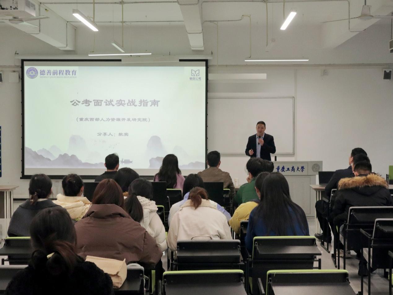 为进一步增强毕业生求职核心竞争力,助力毕业生提升公考面试技巧,12月29日下午,由重庆工商大学党委研究生工作部(研究生院)主办、马克思主义学院承办的“应届生公考面试实战指南”专题讲座在明智楼110102教室举行。本次讲座特邀重庆市高级人才寻访专委会秘书长、重庆西部人力资源研究院执行院长敖宾担任主讲嘉宾,共60余名师生参加。