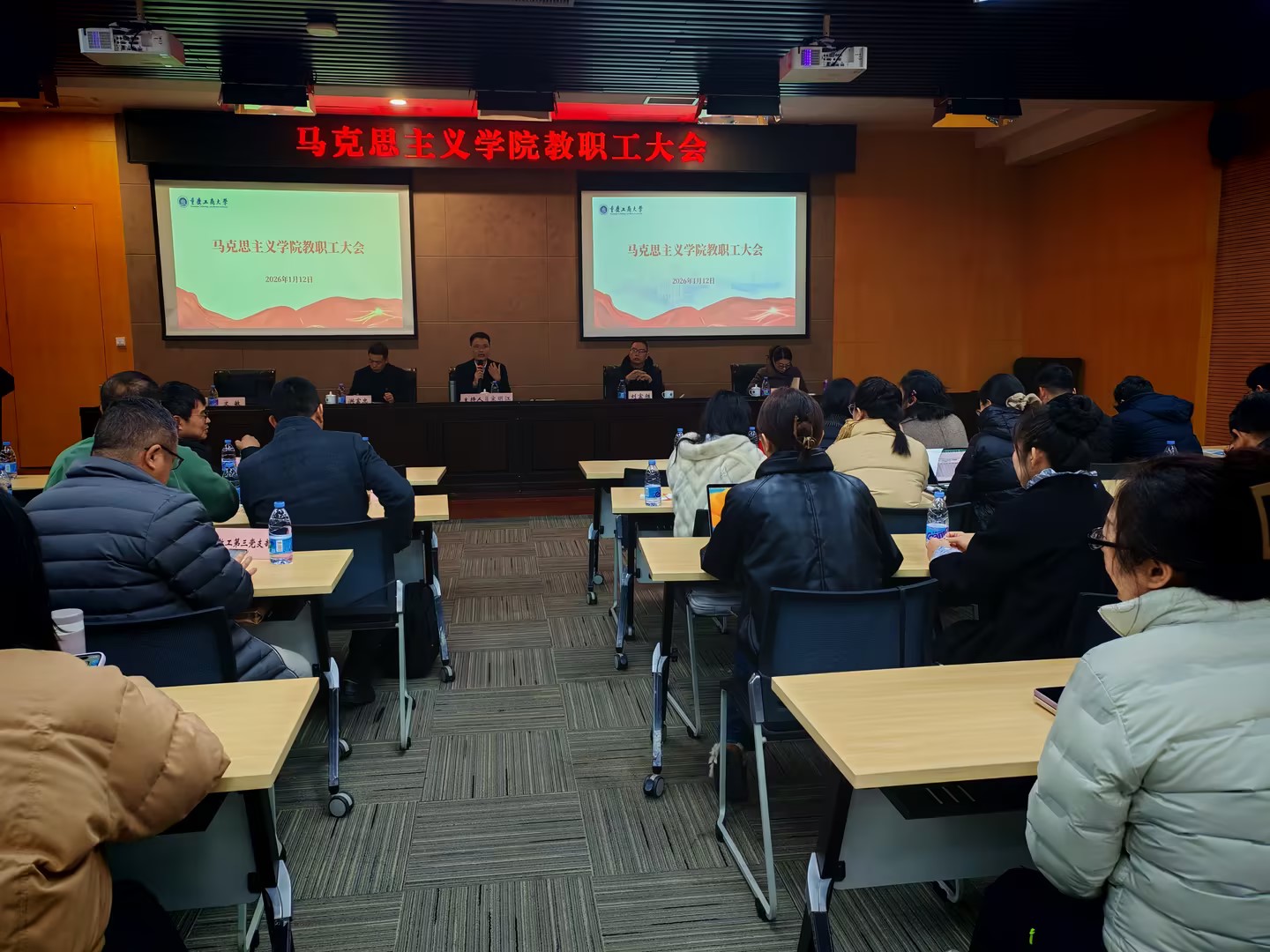 1月12日下午,马克思主义学院教职工大会在图书馆多功能厅顺利召开。会议由学院党委书记、副院长宋明江主持,全体教职工参加。