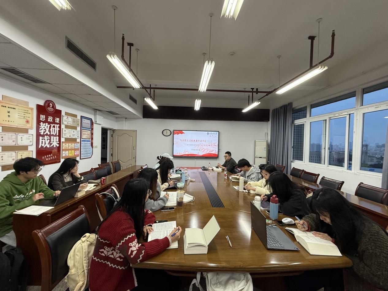 3月12日晚上,马克思主义学院经典著作读书会在慧智楼1210教室如期举办。本次活动以《政治经济学批判(1861—1863年手稿)》(以下简称《61-63年手稿》)摘选为核心研读文本,由曾冰老师主讲,法社学院法学专业部分同学、会计学院ACCA专业部分同学、马克思主义基本原理研究方向一、二年级研究生全员参与。活动旨在深化青年学子对马克思主义政治经济学经典的系统性理解,强化对马克思主义经济学原理的精准把握,搭建高质量师生学术交流平台,引导青年在经典研读中坚定信仰、锤炼本领、勇担时代使命。