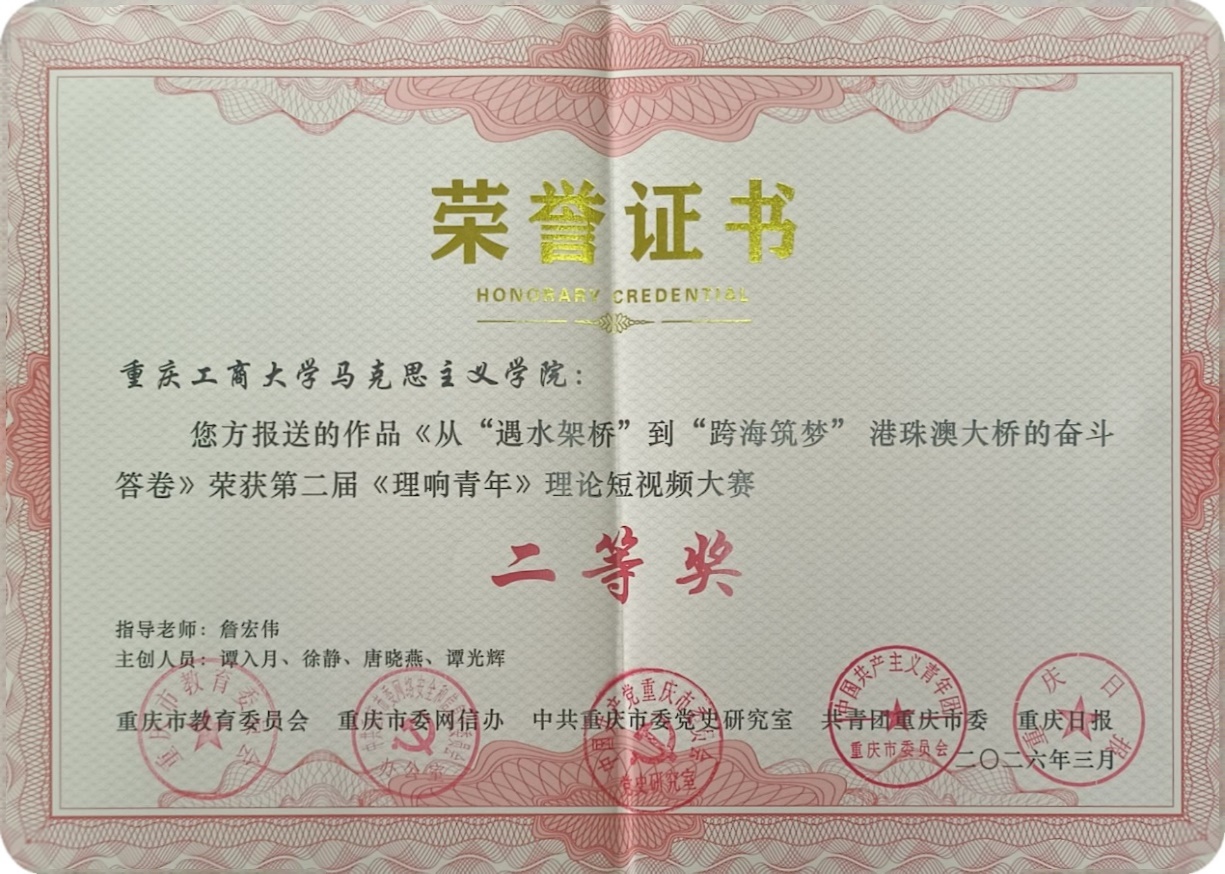 本次参赛作品的创作缘起于一次思政综合实践作业。团队成员谭入月以自己父亲参与港珠澳大桥修建的亲身经历为蓝本撰写文章,鲜活的一线故事、动人的建设情怀,让团队决定将其改编为理论短视频参赛。在詹宏伟老师的专业指导下,谭入月、徐静、唐晓燕三位团队成员凝心聚力、精益求精,围绕作品内容反复打磨修改,历时三四个月完善脚本与文案;后续又投入半个月时间,完成视频拍摄、素材剪辑与后期制作,最终形成兼具思想性与感染力的作品。该作品被重庆日报“理响青年”采用,并被“学习强国”平台转载,随后被推荐参加第二届《理响青年》理论短视频大赛,最终脱颖而出,荣获二等奖。