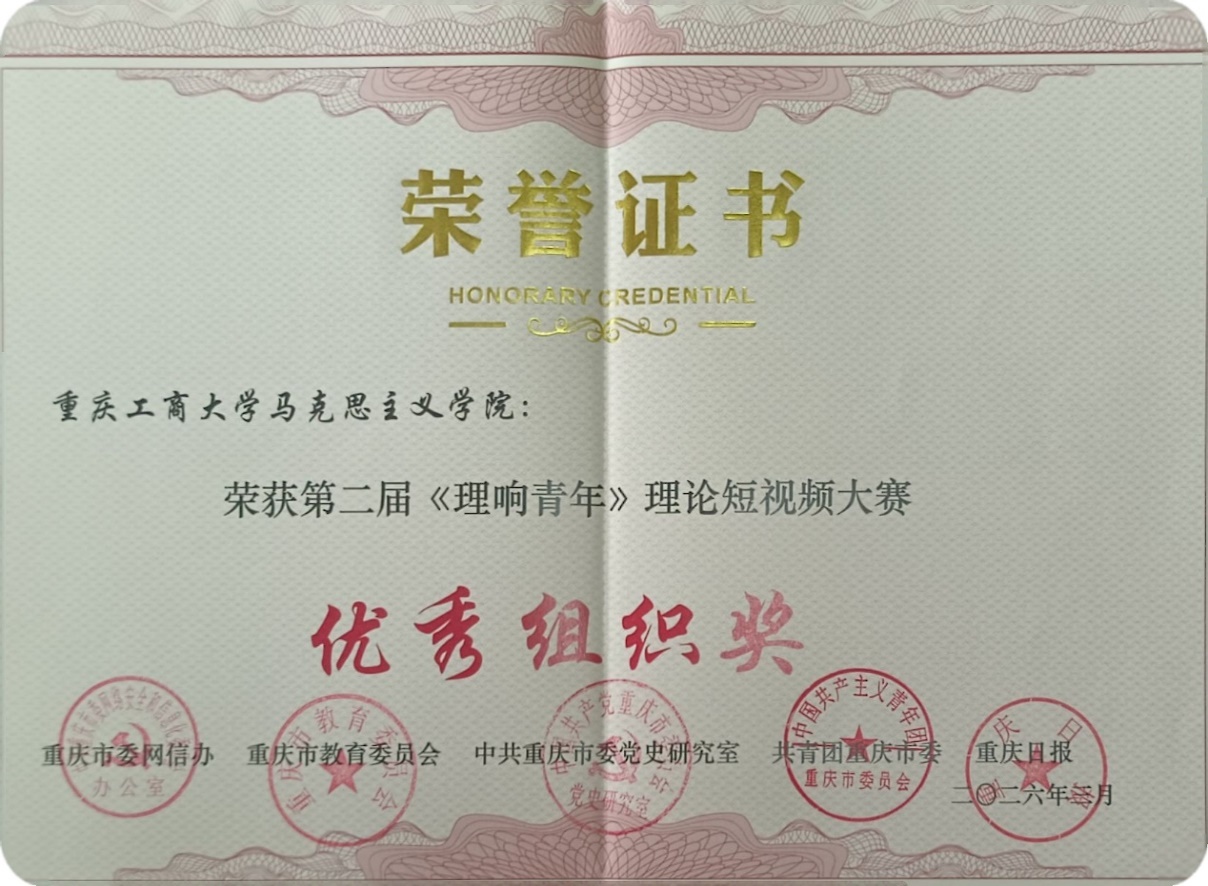 近日,由重庆日报联合重庆市委网信办、重庆市教育委员会、中共重庆市委党史研究室、共青团重庆市委主办的第二届《理响青年》理论短视频大赛获奖名单正式公布。我校积极参赛,报送的作品凭借鲜明的青年视角、真挚的内容表达,斩获大赛二等奖;我校马克思主义学院还获优秀组织奖,收获颇丰、佳绩频传!