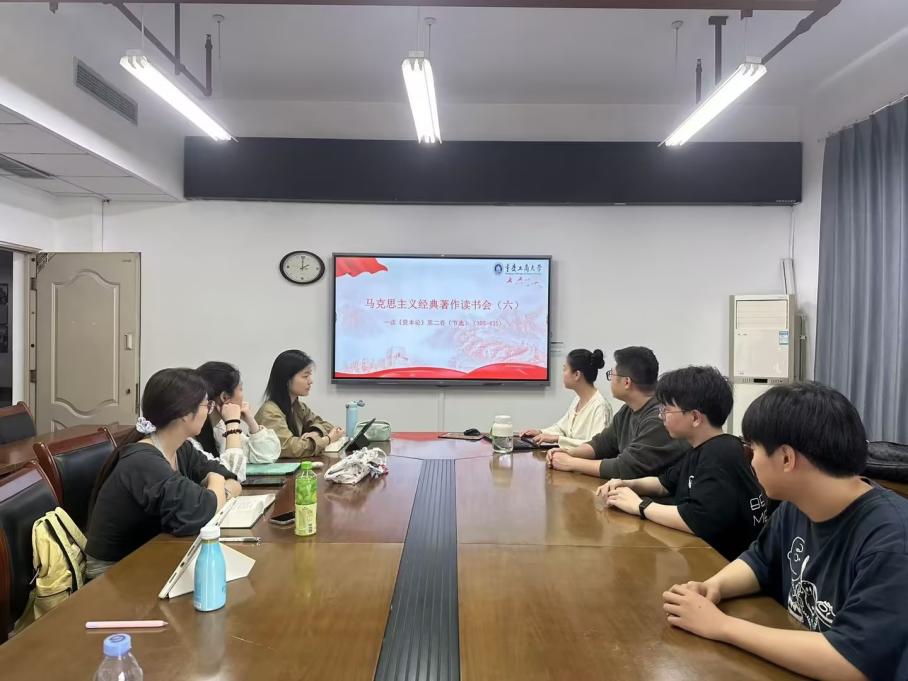 为深化学生对马克思主义政治经济学理论体系的系统把握,搭建师生研学共进、互鉴共勉的学术交流平台,马克思主义学院于4月9日下午14:00,在慧智楼1210举行本学期第六次马克思主义经典著作读书会,共同研读马克思《资本论》第二卷(305-435页)部分。本次读书会由杨洁博士担任主讲人,马克思主义基本原理教研室曾冰老师、法学与社会学学院部分同学以及马克思主义基本原理方向 2025 级硕士研究生共同参与。