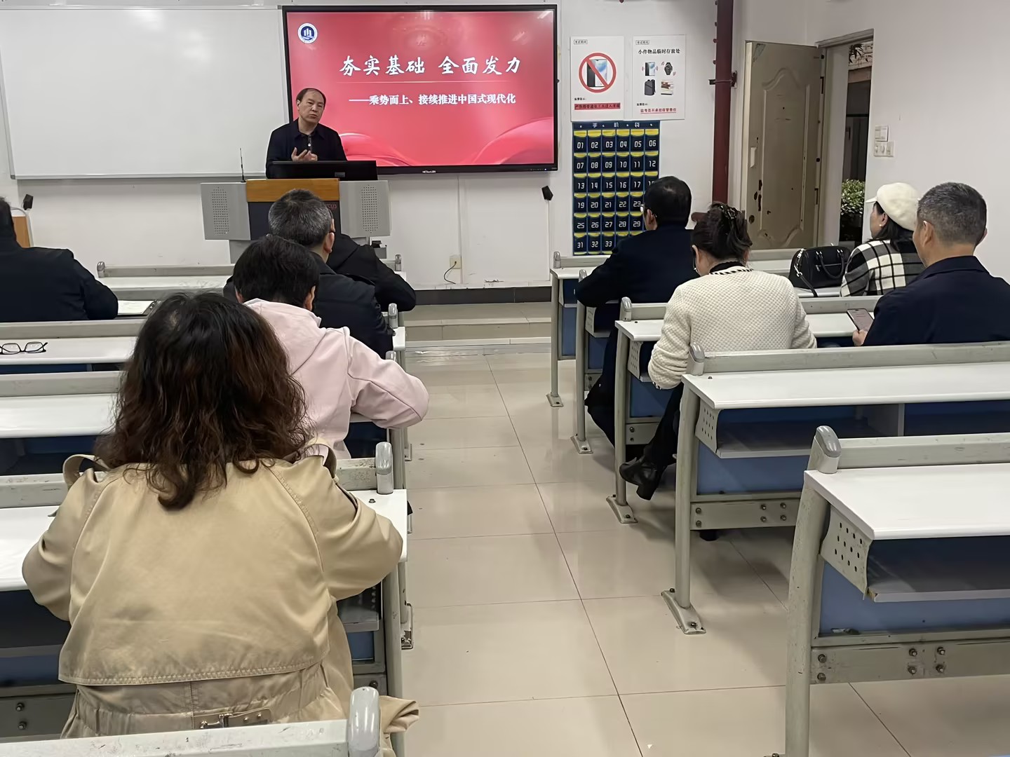 会上,黄伟教授以“夯实基础全面发力——乘势而上、接续推进中国式现代化”为主题,紧扣党的二十届四中全会精神与“十五五”规划建议,系统梳理课程核心要点,精准阐释历史方位、战略部署与青年使命。他结合教学实际,明确教学重点难点,分享案例选用、话语表达、互动设计等实用方法,为提升课堂吸引力与说服力提供清晰指引。参会教师围绕教学内容、授课节奏、素材更新等展开深入交流,统一教学导向、规范教学口径、优化教学方案。